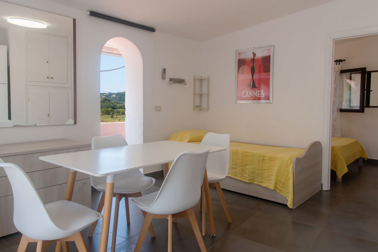 La villa è divisa in cinque appartamenti monolocali o bilocali, ognuno con il suo spazio all'aperto attrezzato con tavolo, sedie e sdraio per poter mangiare o rilassarsi all'ombra degli alberi.