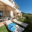 All’esterno, la terrazza privata è arredata con tavolo, sedie e lettini prendisole, ideale per pranzi, cene o momenti di relax all’aperto.