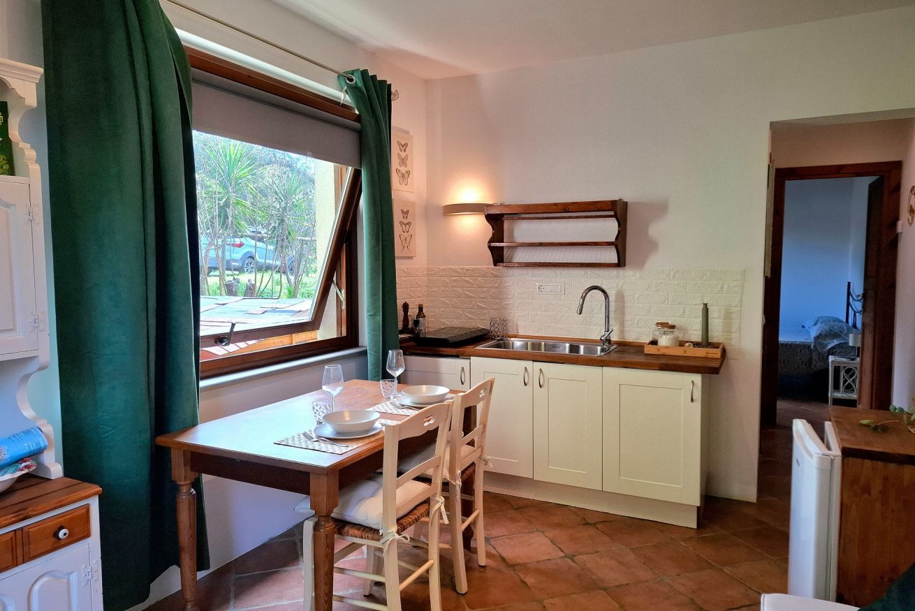 Completano l’alloggio un comodo posto auto privato che permette di dimenticare lo stress del parcheggio, e uno spazio esterno attrezzato direttamente nel verde dove rilassarsi, leggere, fare colazione o semplicemente godersi il silenzio e i profumi della macchia mediterranea.
